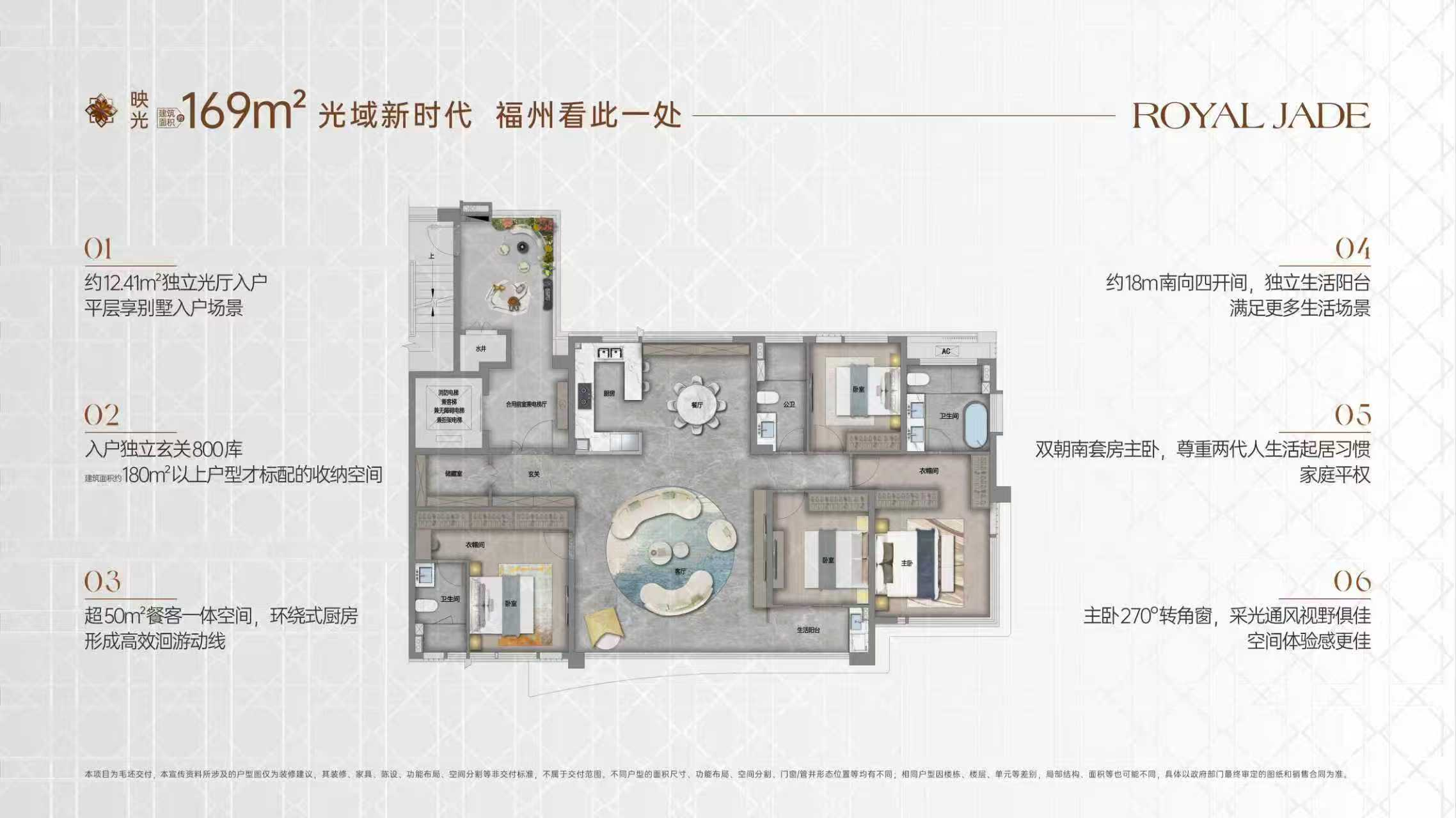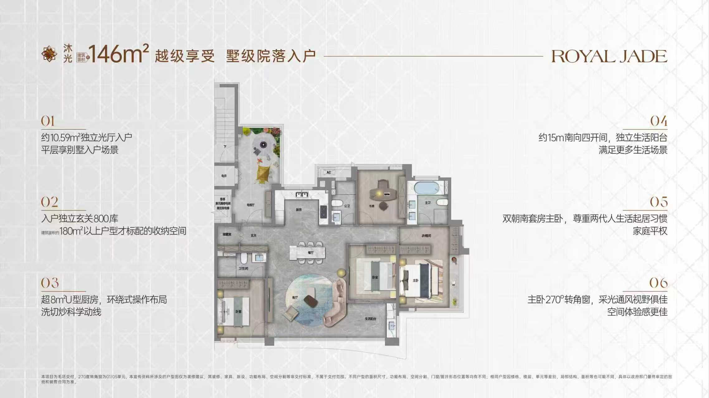 具体来看几个核心户型,项目推出了约146㎡和169㎡的光厅作品。约146㎡户型实现了四开间朝南的极致面宽,而约169㎡户型则拥有更为奢阔的空间尺度,双主卧套房的设计完美解决了三代同堂的居住痛点。所有户型层高均为3.1米,毛坯交付。