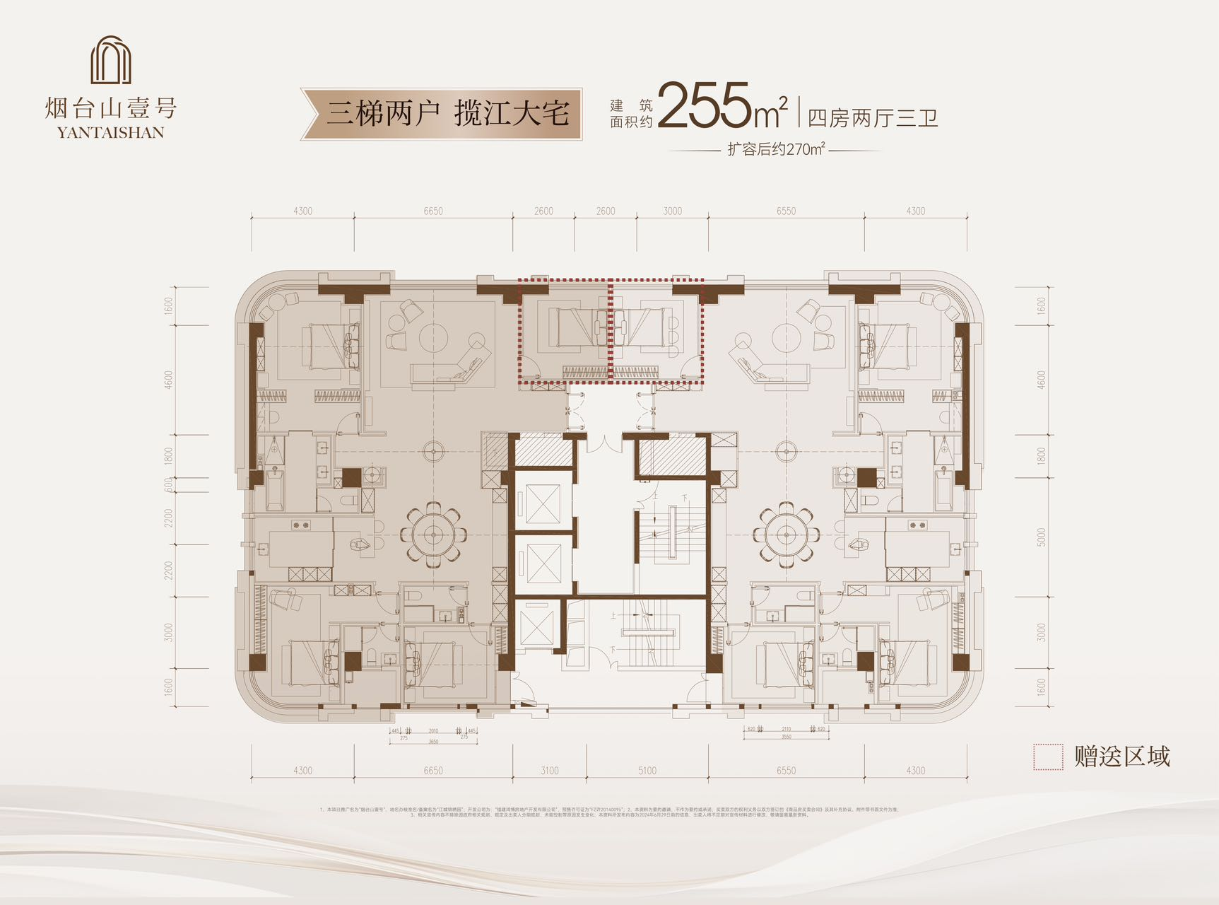 烟台山壹号的户型是其核心竞争力之一。项目主打255到526平方米的纯粹大平层和复式户型,彻底告别了中小户型产品的干扰。单套建筑面积约255平方米,扩容面积约270平方米,也可以选择双套整层打通,建筑面积做到约526平方米,实现一层一户的私密与尊贵。