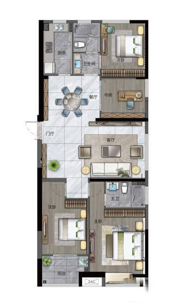 这是一个四室两厅两卫的设计。这个户型足够满足三代同堂家庭的居住需求。客厅整体面积约为27平方米,空间宽敞,适合家庭娱乐或亲子活动。次卧还带有内包阳台,可以改造成家政空间或休闲阳台,增加了居住的灵活性。